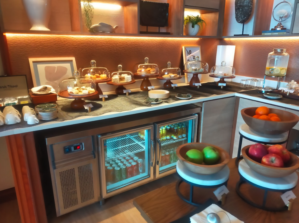 デュシタニのラウンジです。デュシタニのスタッフさんからすごくおもてなしされた感覚を覚え、リゾート地に来たんだなあとしみじみと感じました。ラウンジは色々と飲み物と軽食が用意されており食べ放題になっています。