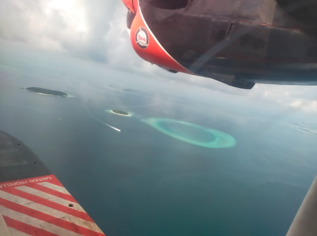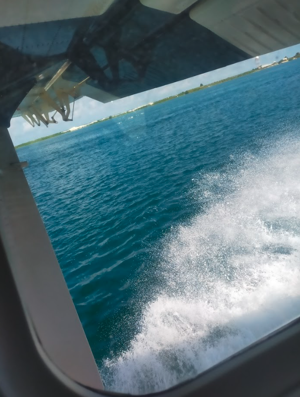 離陸します。エンジンの音がかなり大きく耳栓必須です。排気ガスの匂いもなかなか強いです。正直、快適ではないかも知れませんが初めての水上飛行機ということで気分は上がります。子供たちは疲れてぐったりしています。