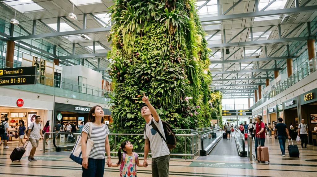 シンガポール到着は午前5時。まだ暗い空港に降り立つと、真っ先に目に飛び込んできたのが巨大な室内ジャングル。T3ターミナルの「Green Wall」エリアです。